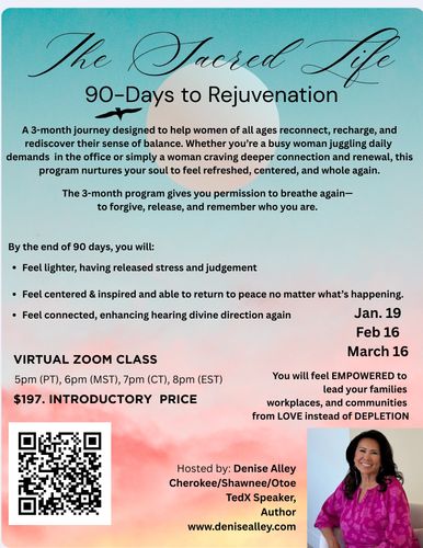The Sacred Life: 90-Days to Rejuvenation is a gentle yet powerful 3-month journey created for busy women who feel a need to slow down, restore balance, and take a moment to breathe. This program helps women release stress, quiet the mind, and let go of emotional and physical heaviness—without adding more to their already full life. Through simple, but powerful practices participants will learn how to care for their energy, and renew for their well-being. Over the 90 days, you will feel lighter, calmer, more centered, and inspired, while being supported in a safe, nurturing space in our virtual class.